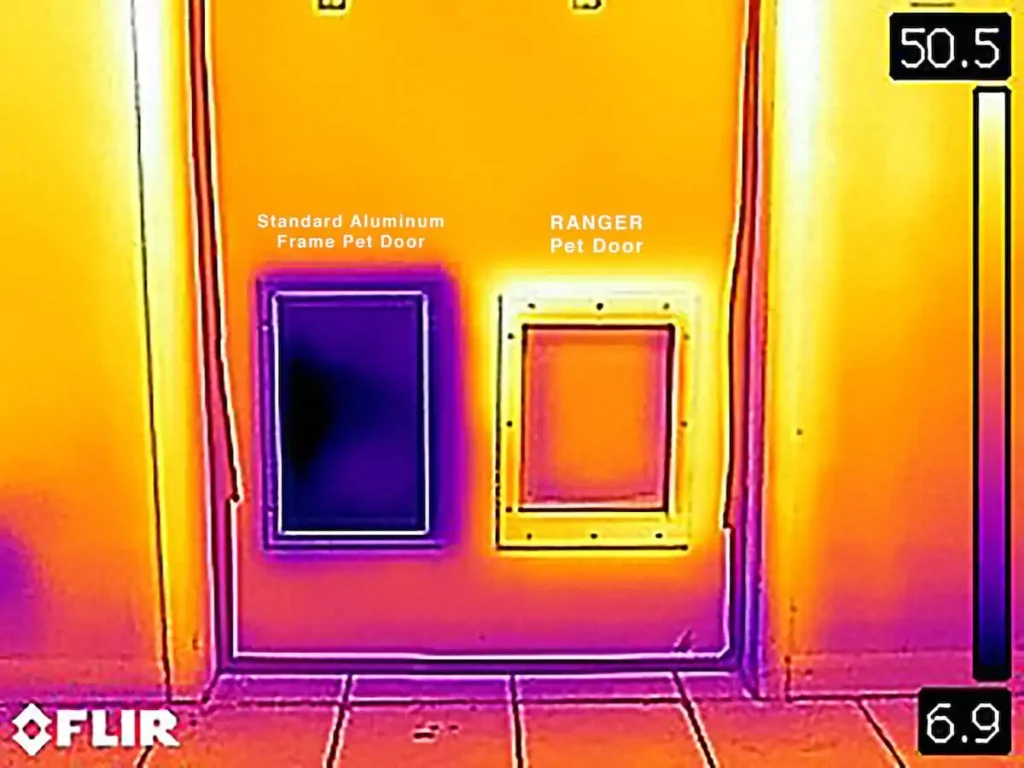 Most pet doors, like the “best selling” dog door shown on the left of FLIR thermal image, do nothing but let cold into your home. The flap leaks, and the metal frame conducts the cold outside temperatures right into your house.
